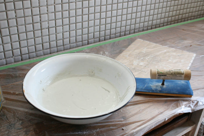 さてさて、キッチンのモザイクタイル貼りはじめますよ~