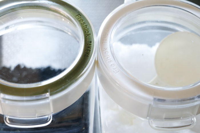 整列~♪保存容器をホワイトで統一!なんと気持ちのよいことでしょう。長年愛用していたフレッシュロック、知らない間にホワイトが登場していたのですね。ネットで購入してパッキンだけ白にチェンジ!うん。断然ホワイトがいいな。